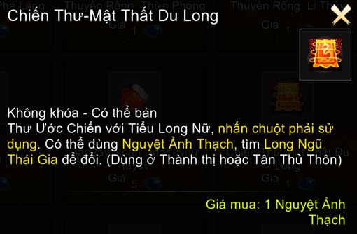 - B2 : Sử dụng Nguyệt Ảnh Thạch đến Long Ngũ Thái Gia để đổi lấy Chiến Thư – Mật thất Du Long.