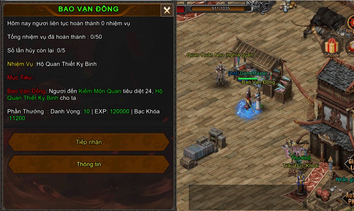 - Khi nhân vật đạt cấp 20 (Không cần vào môn phái) có thể đến NPC Bao Vạn Đồng để nhận nhiệm vụ nghĩa quân.